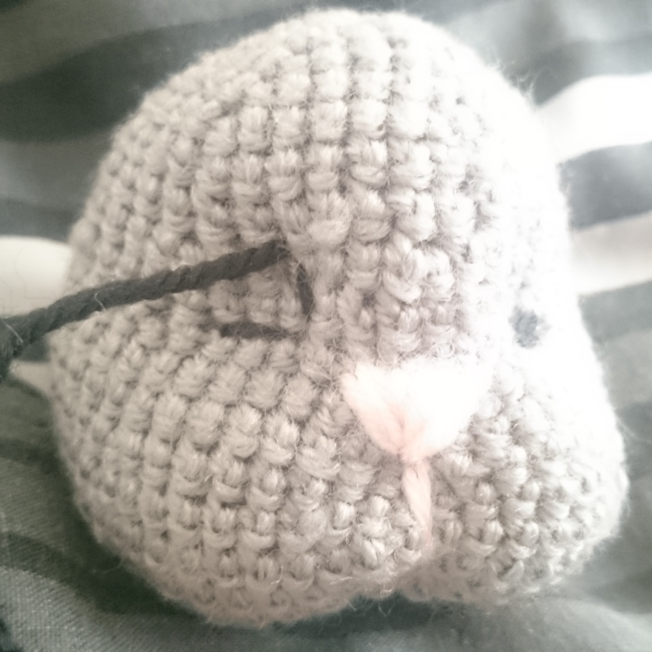 Using gray coloured yarn single crochet around the ears. I have a feeeling it would look better with a furry yarn.